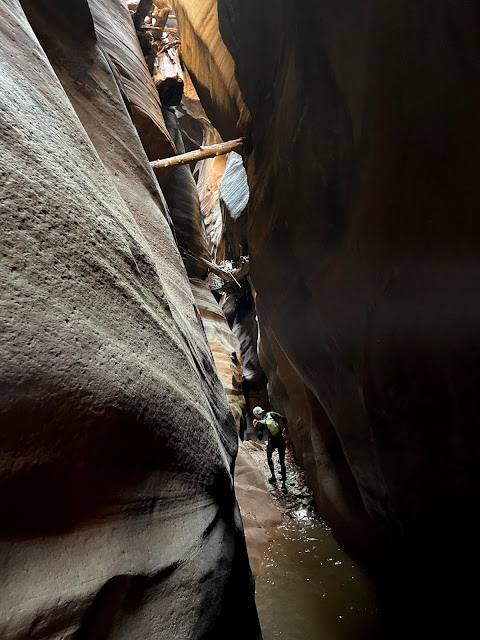 Just a few years ago we descended the Narrows in March while it had ice in the water, but today would be cooler temperatures. After Keyhole, we headed over to Pine Creek and began our descent. While the canyon was beautiful, it was extremely cold, and even with wetsuits we were quite miserable a few times. When we exited the canyon, we stripped off the wetsuits and basked in the sun on the side of the road. The tourists must have wondered what the heck we were doing half naked with ropes and harnesses laying all around. I'd like to go back when it's warmer and do this canyon again.
