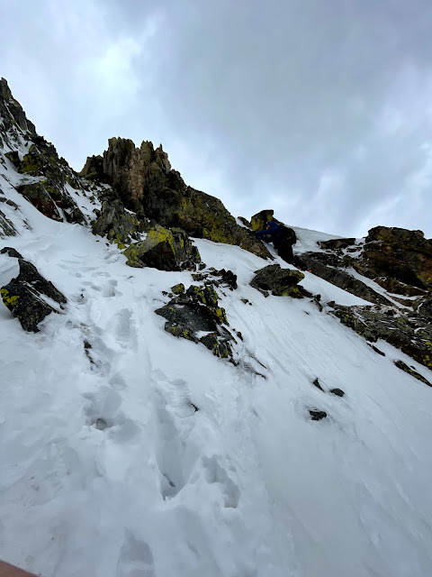 Looking out across the ridge that leads to North Apostle, we knew we were in for a spicy downclimb and traverse. The snow conditions were not great and the rock was loose and slippery. Continuing on in our crampons, we scrambled down the exposed ridge making a few 5th class moves to get down to more solid snow. We chose what we thought was the easiest way to the saddle of the two peaks and it was not an easy chore. In summer there is likely a decent trail here but it is a completely different experience in winter conditions.