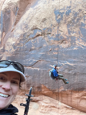 Sunday morning we woke at 7 and were driving by 7:45. This time we would head for the Poison Spring area and Constrychnine canyon. We had enjoyed Arscenic canyon in this area last time and were looking forward to today. Weather was great at around 60 degrees in the afternoon, but it was windy, which Hazel did not enjoy. Hiking along and approaching the start of the canyon, you can tell that this is a big, deep canyon. It is awesome as well as a bit intimidating looking down at the size of what we're about to descend. We took our new 300' rope as well as 200' rope. This would comfortably get us down the longest 165' rappel. At the top of the canyon, Laura and Hazel rappelled first. I had them on a second rope, lowering them as a backup since this was the first time Laura had rappelled on the new 300' rope. It looked like the rope was going to pull our backpack off, so I moved it over and subsequently forgot to take it with me when I rappelled. We now had no food or water for the day. Not a good situation, but we made fast time through the remainder of the canyon. The rappels were all big and fun and it was a spectacular area. We were amazed by its beauty. Hazel enjoyed walking several parts and the climb out was uneventful. We hiked over to a meeting spot where Laura and Hazel played in the sand while I went back and grabbed our backpack. When I met back up with them, we relaxed, ate some food and played in the sand with Hazel. Round trip, we were back to the car around 2:10 pm, about 5 hours car to car. We will definitely be back to this one as it ranked in our top 5.