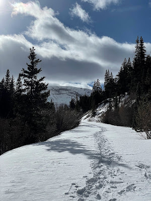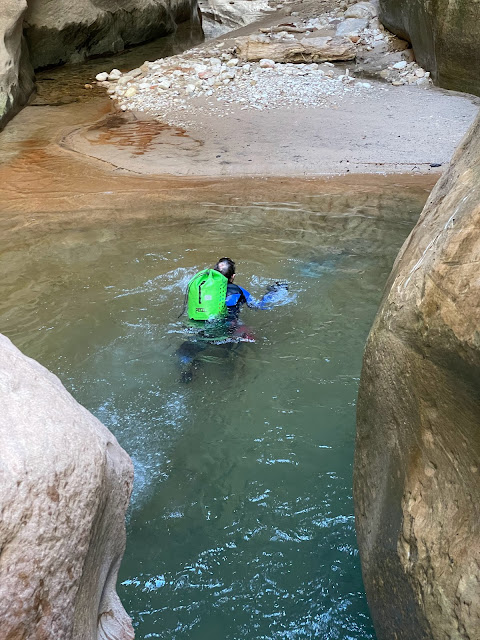 So, when Laura reached the bottom of the rappel, Isaac pulled the long rope back up they headed back to spend a tourist day in the park. Laura, John and I continued down the canyon, efficiently moving through the first 5 rappels. We would descend short drops onto frozen pools and were continuously on snow. We crossed several sections with 20+ feet of snow. We weren't sure if this made the canyon easier or more difficult but it was beautiful and fun.
